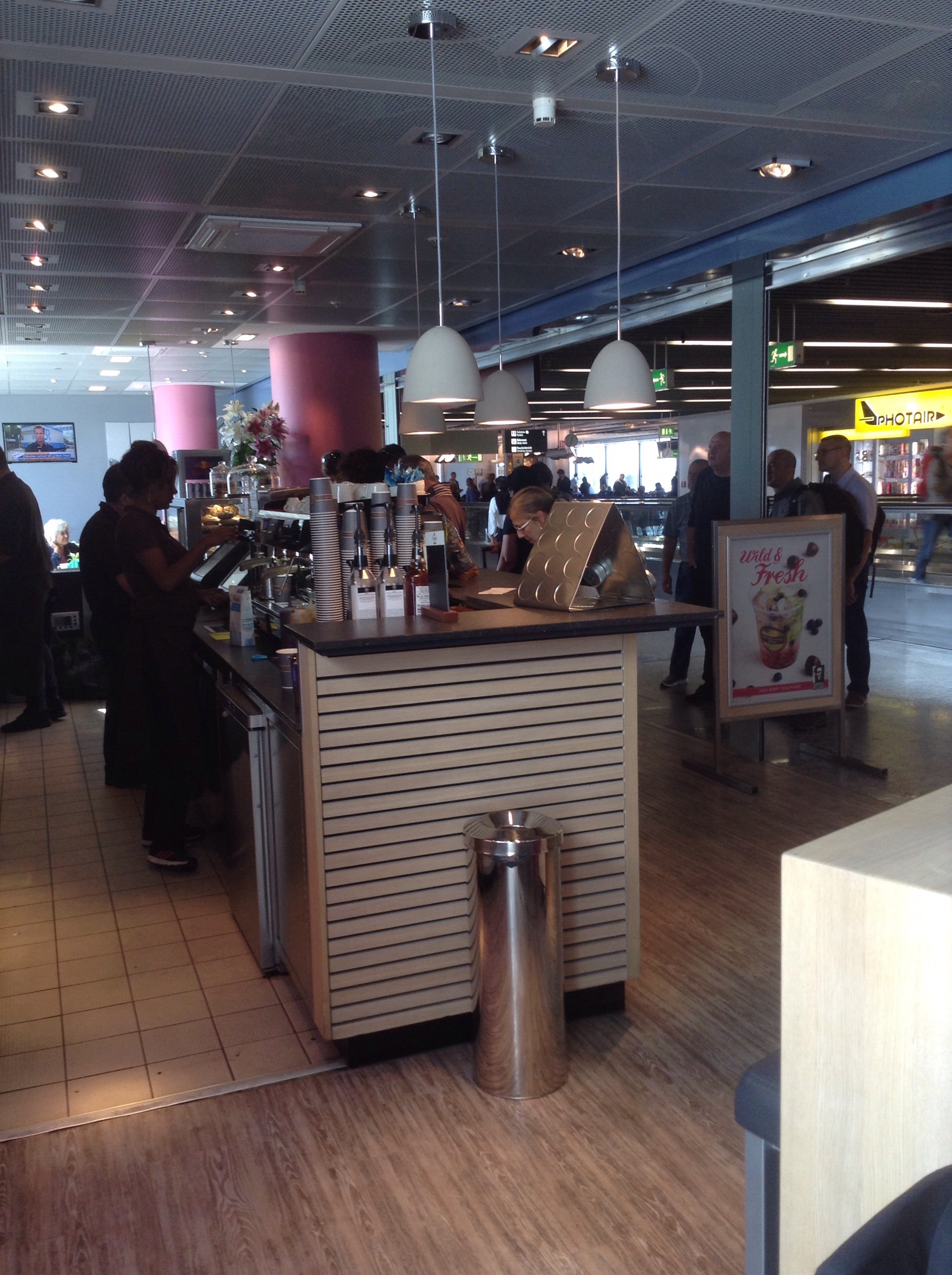 Well, I had the opportunity to walk from gate A20 to Z20 thereby getting to see the entire Frankfurt airport. (OK, it doesn’t go through the entire alphabet). I had the opportunity to order a mocha at a little coffee bar opposite the gate for an exchange rate of about 2 to 1 when it should be 2 to 1.75. Then I had to add my own cocoa. See how adventurous??