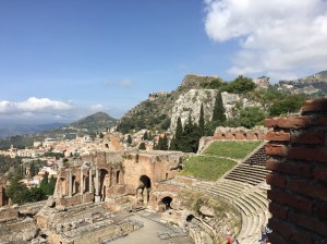 Hanging around Taormina and enjoying the sites, sounds, sun and serenity. We had a bit of an excursion getting here via Messina. Thinking we could take a short cut off the autostrada it became apparent that a 2 hour trip would take 16 hours (according to google maps). Decided it was better to get back on the autostrada and not try to drive over Mt Etna. We have a lovely view of the Sea in our little Airbnb. The waves are soothing and I just had a delicious meal of crostini with anchovies and cheese and seafood ravioli. Some folks living on Malta and sitting next to me said it’s the best meal they’ve had since Capri! La de da.